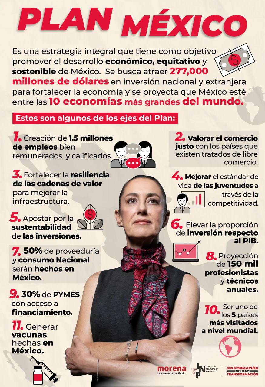 La Presidenta, Claudia Sheinbaum Pardo presentó el Plan México, una visión del presente y el futuro sobre el desarrollo nacional, que está conformado de 13 metas cuyo objetivo es hacer de nuestra nación el mejor país del mundo disminuyendo la pobreza y la desigualdad y el cual contempla un portafolio de inversiones, nacionales y extranjeras, de 277 mil millones de dólares (mmdd).